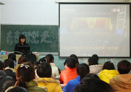 学习期间,各班通过播放视频观看了十八大的开幕盛况以及会议内容,而且分组讨论了与十八大有关的精神。同学们还纷纷走上讲台分享了自己对十八大精神的看法,并通过自己身边的变化来阐述中国近年来在中国共产党的正确领导下所取得的辉煌成就。