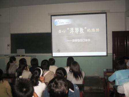 自9月10日起,环境与规划系组织的“抵制邪教,预防流感”系列视频教育活动在全系大力展开,本次活动将持续到本月底结束。9月16日晚7点,环境与规划系视频教育活动第一次播放在09级地理科学班进行,在全系引起强烈反响。活动进行中,会场秩序井然,同学们聚精会神地观看。