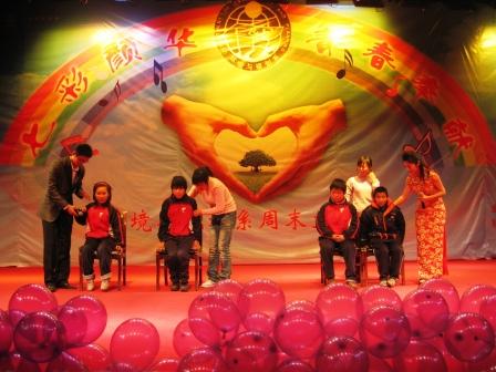 紧接着,一曲手风琴、小提琴合奏的《西班牙舞曲》让观众一睹高雅艺术的风采。随着一阵温和悠扬的乐曲响起,四名来自盲校的儿童带来了歌曲《盲童心愿》、《盲童校歌》以及戏曲《卷席筒》选段,展现了其身残志坚,自强不息的精神,深深地震撼打动了在场的每一位观众。伴随着《欢聚一堂》的歌声,晚会进入尾声。