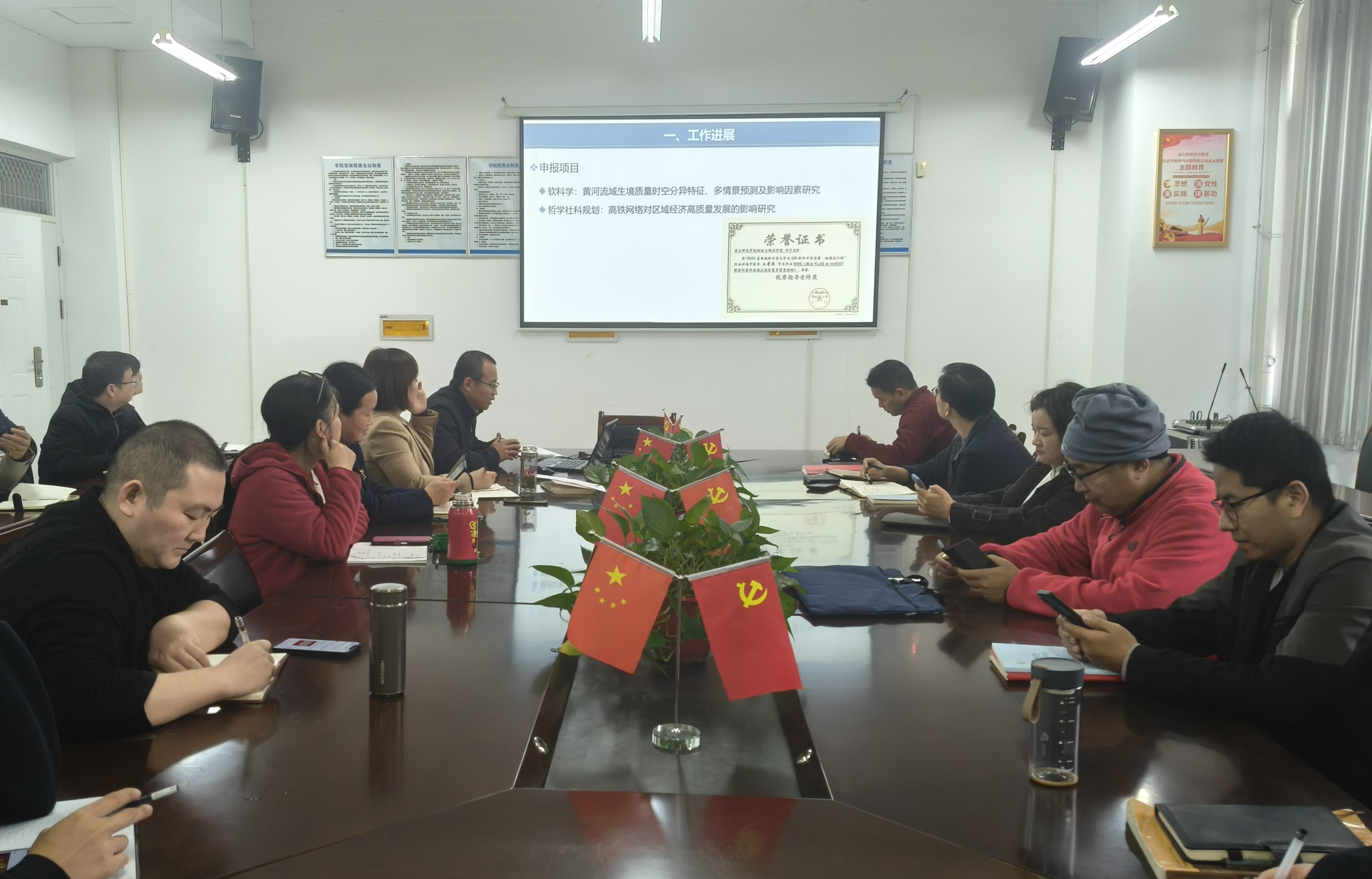许宁博士汇报了黄河流域生境质量时空分异特征、多情景预测及影响因素研究。李佳秀博士汇报了河南省项目“黄河下游地区土地利用变化的潜在生态风险定量评估”的实施情况,详细介绍了黄河下游土地利用变化及生态系统服务价值的时空演变,从景观生态风险的角度,提出分区化土地管理措施。邵培博士依托省自然科学基金项目和青年骨干教师培养计划项目进行了成果汇报,通过生物气生成模拟实验,研究微生物对煤有机质分子结构的影响。另外结合有机酸淋滤实验探讨高铝粉煤灰中多种稀有元素提取工艺,研究成果对煤及燃烧产物清洁高效利用有较好的理论意义。邢会敏博士介绍了现阶段研究的相关成果,AquaCrop模型模拟作物产量结果分析,研究过程中存在的问题及后续研究计划。