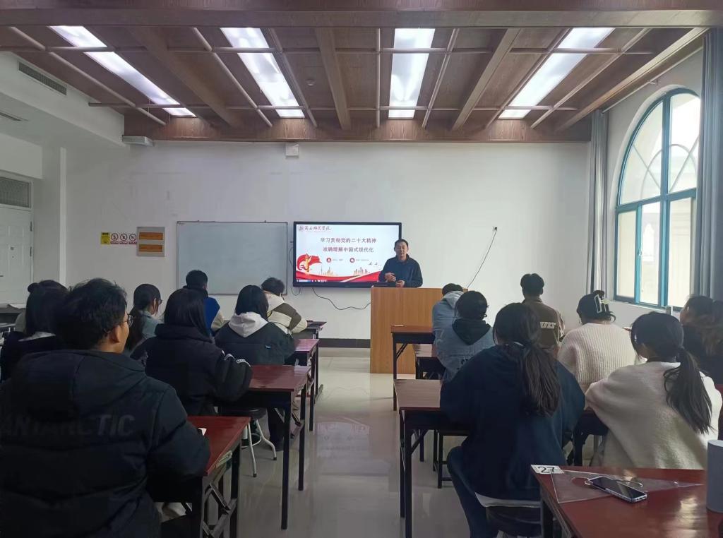为深入学习宣传贯彻党的二十大精神,不断用习近平新时代中国特色社会主义思想武装青年、教育青年,3月24日,beat365中文官方网站辅导员理论宣讲团成员、 beat365中文官方网站辅导员魏理,以“学习贯彻党的二十大精神,准确理解中国式现代化”为题,为学生党员和入党积极分子做了一次精彩的理论宣讲。
