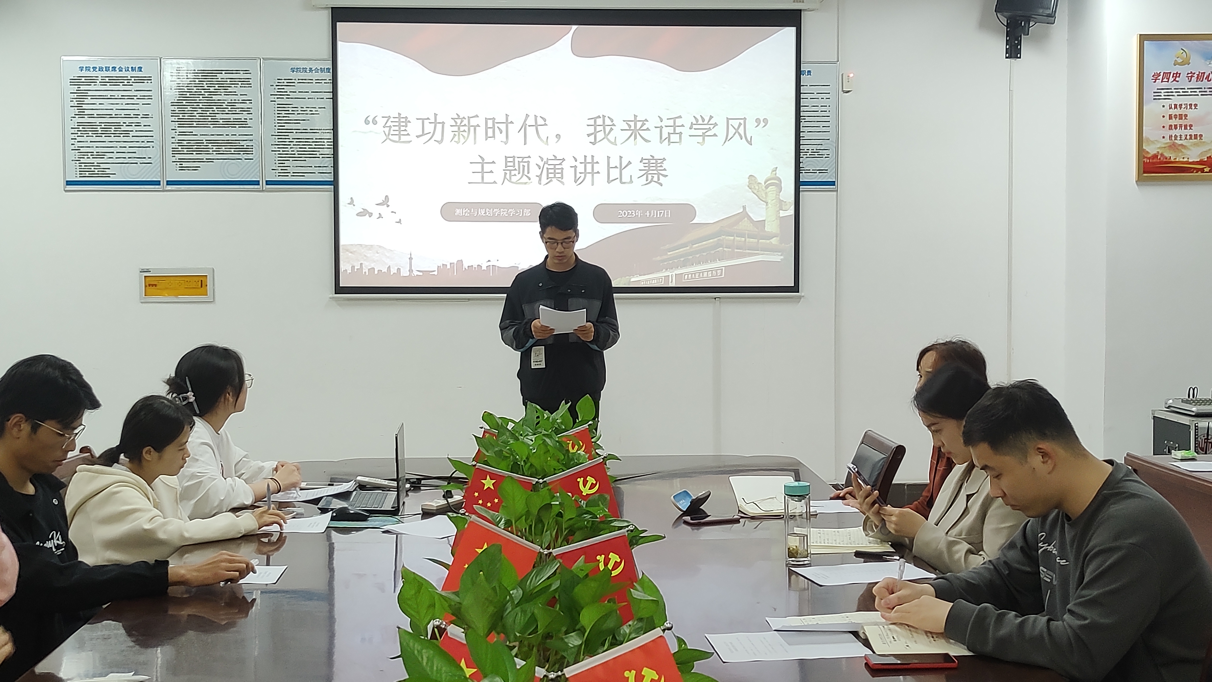 4月17日,beat365中文官方网站于三商楼134会议室举办“建功新时代,我来话学风”主题演讲比赛。担任本次活动的评委嘉宾有院党委副书记王丽,2020级辅导员张瑞杰,2022级辅导员王昊昊,以及beat365中文官方网站学习部的工作人员。2021级和2022级学生代表观看了此次演讲比赛。比赛在同学们的热烈掌声中拉开帷幕。