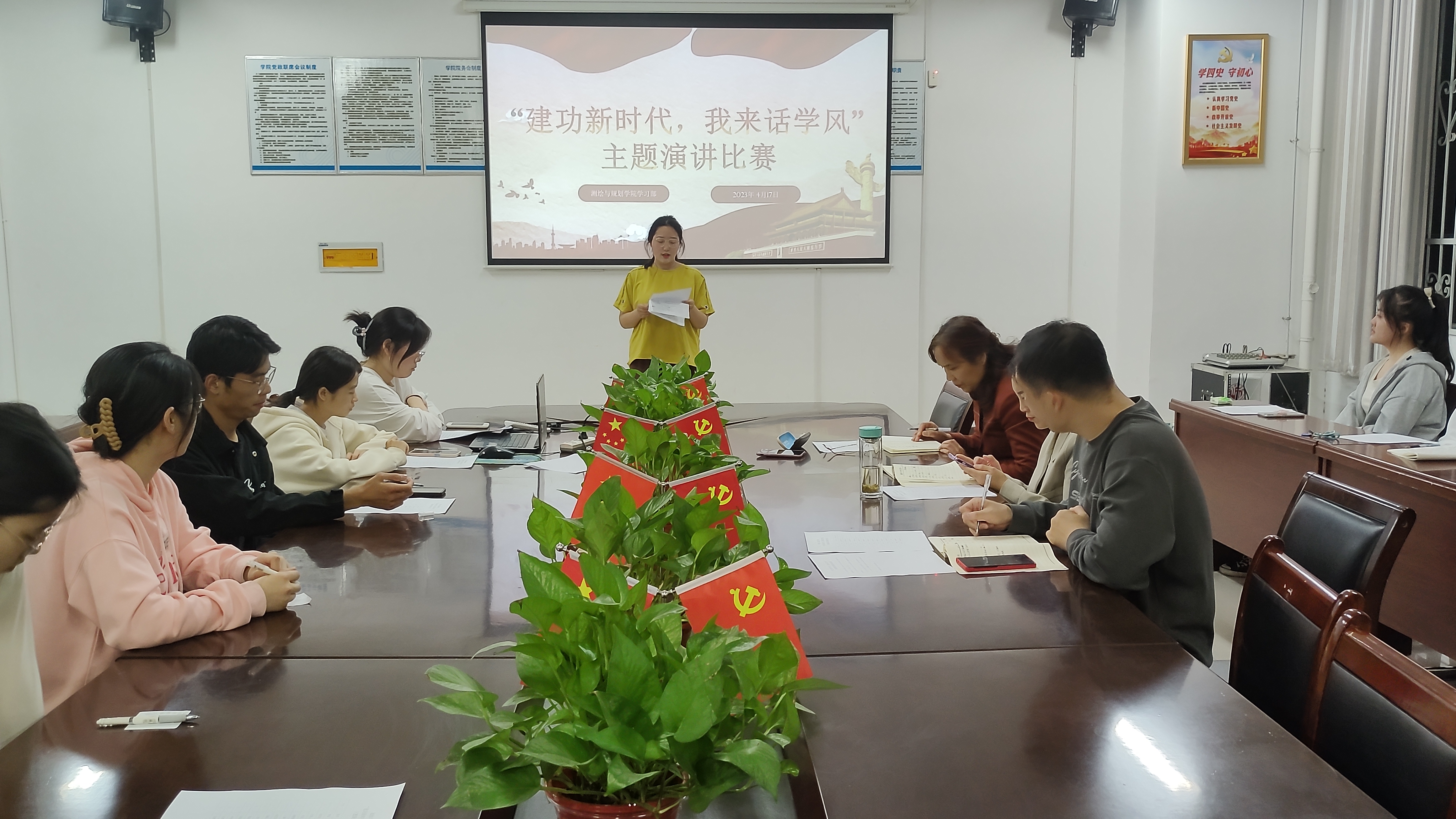 比赛开始后,十四位选手依次上台演讲。他们精神饱满、声情并茂,充分表达了对优良学风的赞美之情。经过了一个小时的激烈角逐,十四位选手全部演讲完毕。王昊昊上台致辞,她针对每位学生的优点提出表扬并对其存在的问题进行指正。她强调演讲是一门语言艺术,并就如何提高演讲技巧提出三点建议,一是明确演讲目标;二是选对主题,搭好框架;三是注意演讲姿势和表情。最后,王丽对比赛做总结发言,她鼓励参赛选手再接再厉,以本次演讲比赛为契机,端正学习态度,提高学习本领。