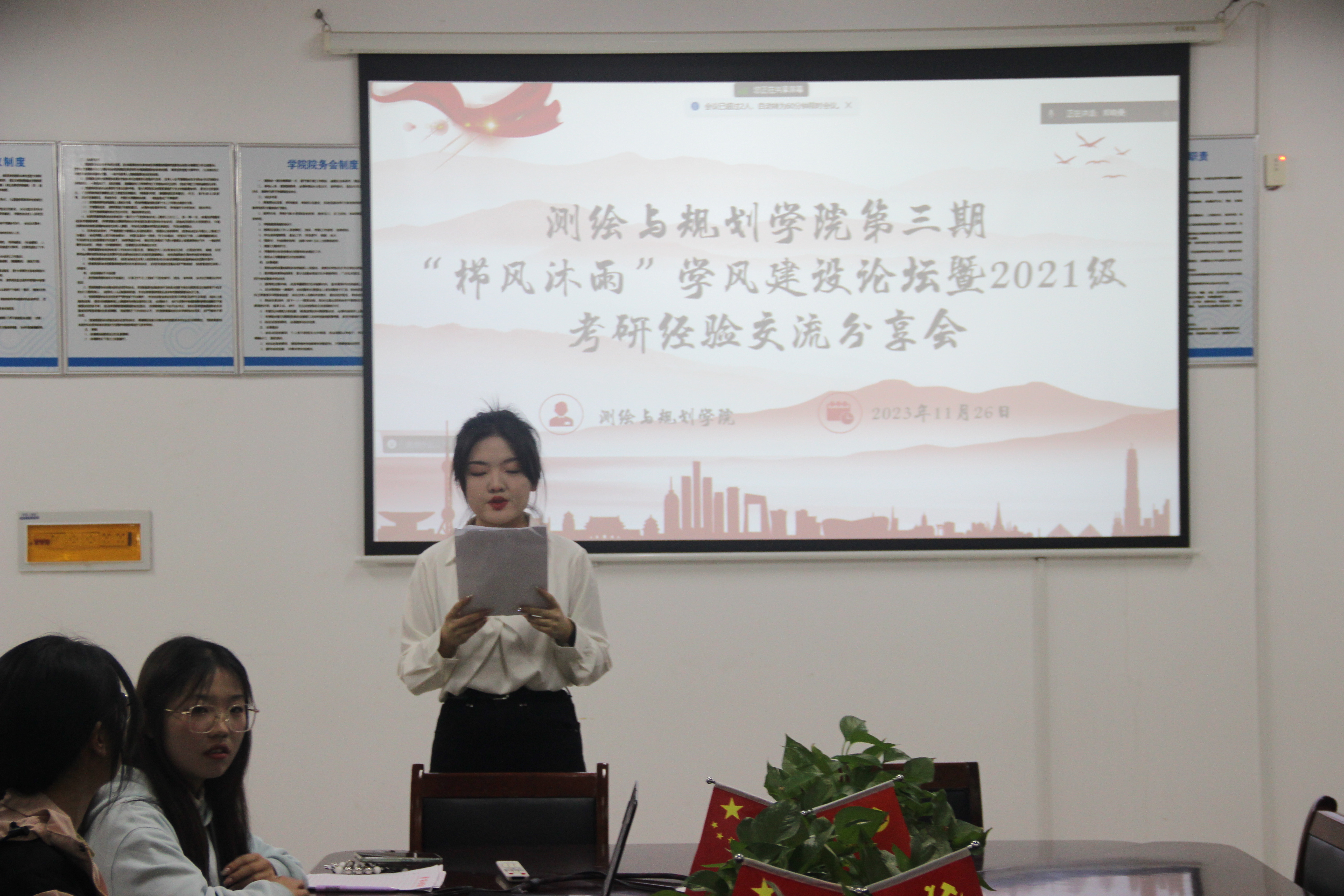 为充分调动beat365官网学生考研积极性,营造浓厚的考研氛围,帮助学生科学备考,提高学习成效。11月26日,测绘与规划学院通过线上线下相结合的方式举行“栉风沐雨”学风建设论坛暨2021级考研经验交流分享会。会议邀请4名2023届优秀考研学生代表分享考研经验,学院学习部,以及2021级测绘工程专业、地理科学专业学生代表参加会议。会议由张萱宇主持。