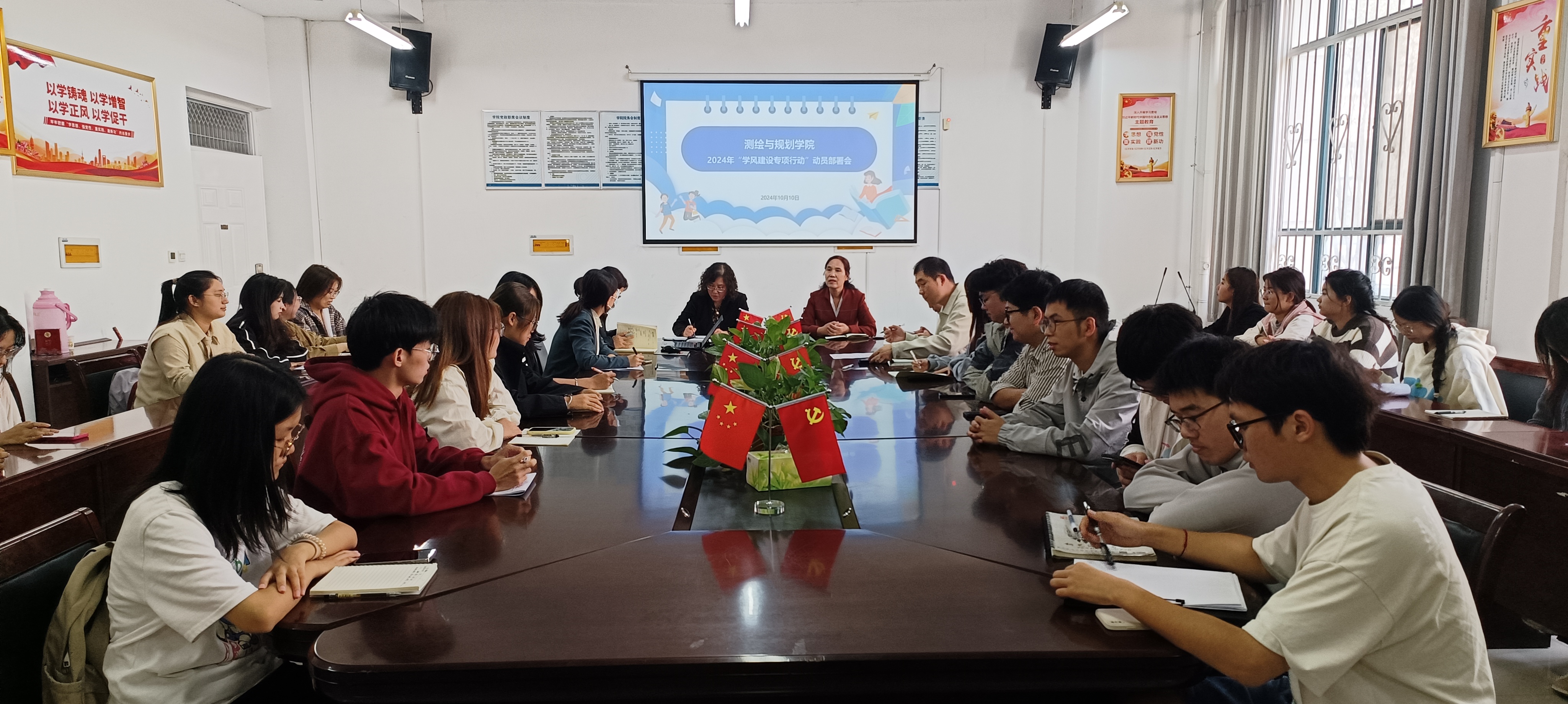 为深入贯彻落实立德树人根本任务,激励广大学生勤奋学习、奋发图强,涵育优良院风学风,提高beat365官网人才培养质量,10月10日,beat365中文官方网站于三商楼134会议室召开2024年“学风建设专项行动”动员部署会,学院党委书记路利、党委副书记王丽、全体辅导员、学生会主席团、学生会学习部、新媒体中心、大一大二大三各班班长及学习委员参加了此次会议。会议由王丽主持。