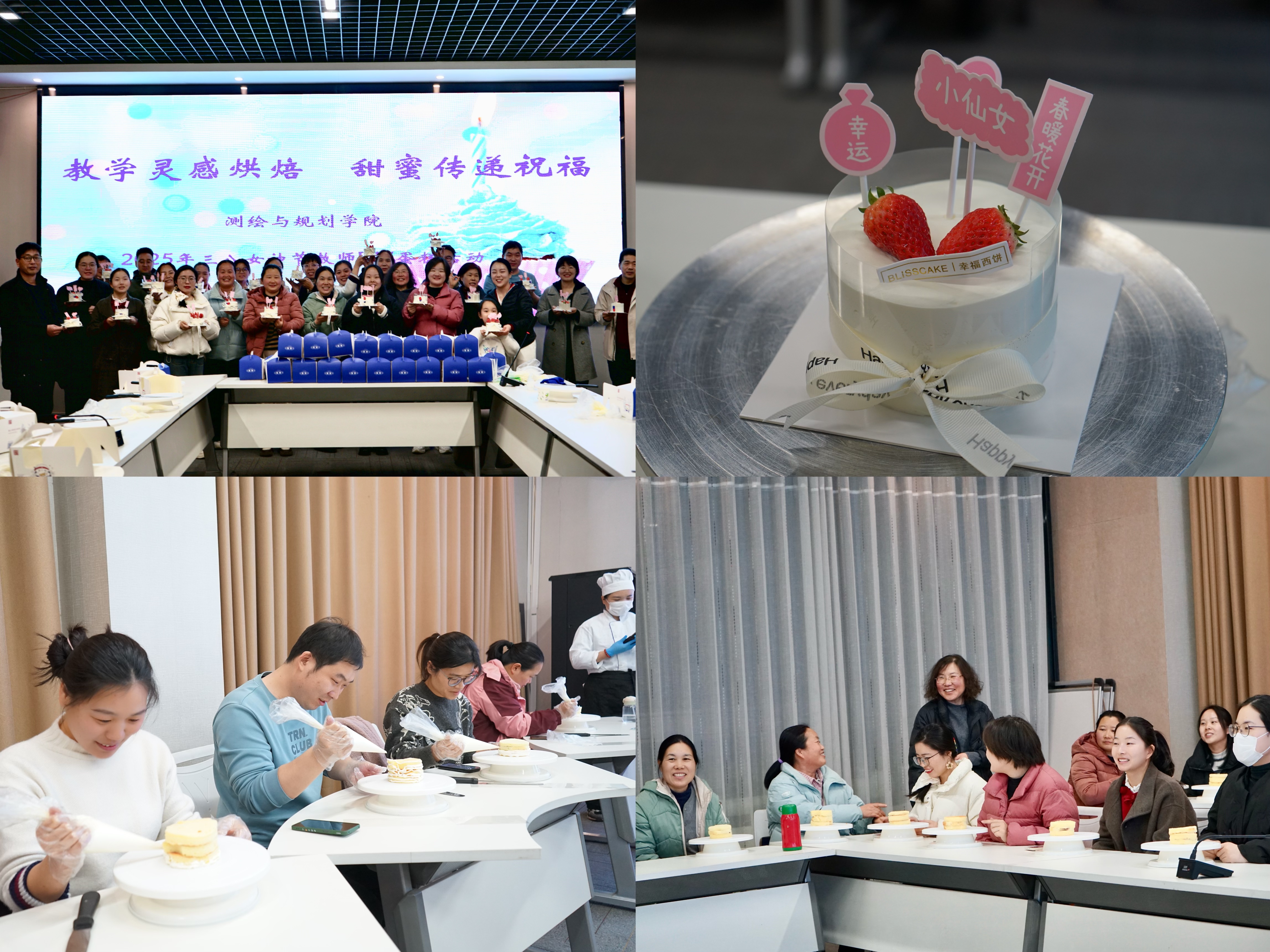 活动伊始,党委书记路利对全院女教师表示节日的诚挚问候。活动现场,专业糕点师首先为大家介绍了蛋糕制作的基本步骤和技巧。随后,在糕点师的指导下,老师们纷纷动手尝试,从搅拌面糊、打发奶油到裱花装饰,每一步都做得有模有样。制作过程中,老师们不仅发挥了自己的创意,将蛋糕装饰得各具特色,还相互交流心得,分享制作经验。整个活动现场充满了欢声笑语,洋溢着温馨和谐的氛围。