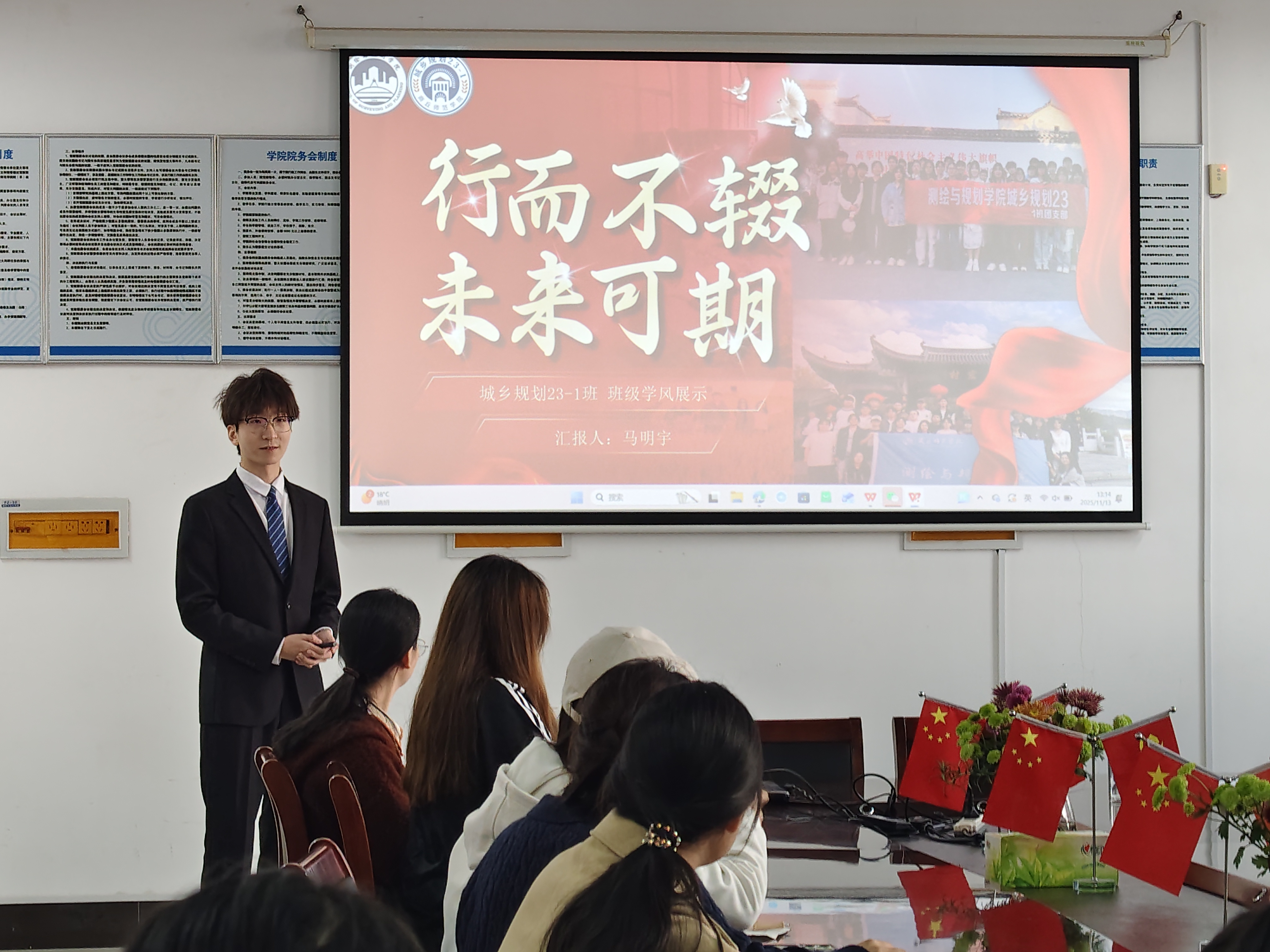 比赛伊始,姜墨涵介绍了比赛流程、评分标准及相关要求。随后,23级各参赛班级代表依次上台演讲汇报。汇报中各班级选手分别从思想引领、学风建设、文化建设、综合成果等维度,系统呈现了班级建设的创新实践与丰硕成果,充分彰显测规学子笃行不怠、逐优而上的昂扬姿态。