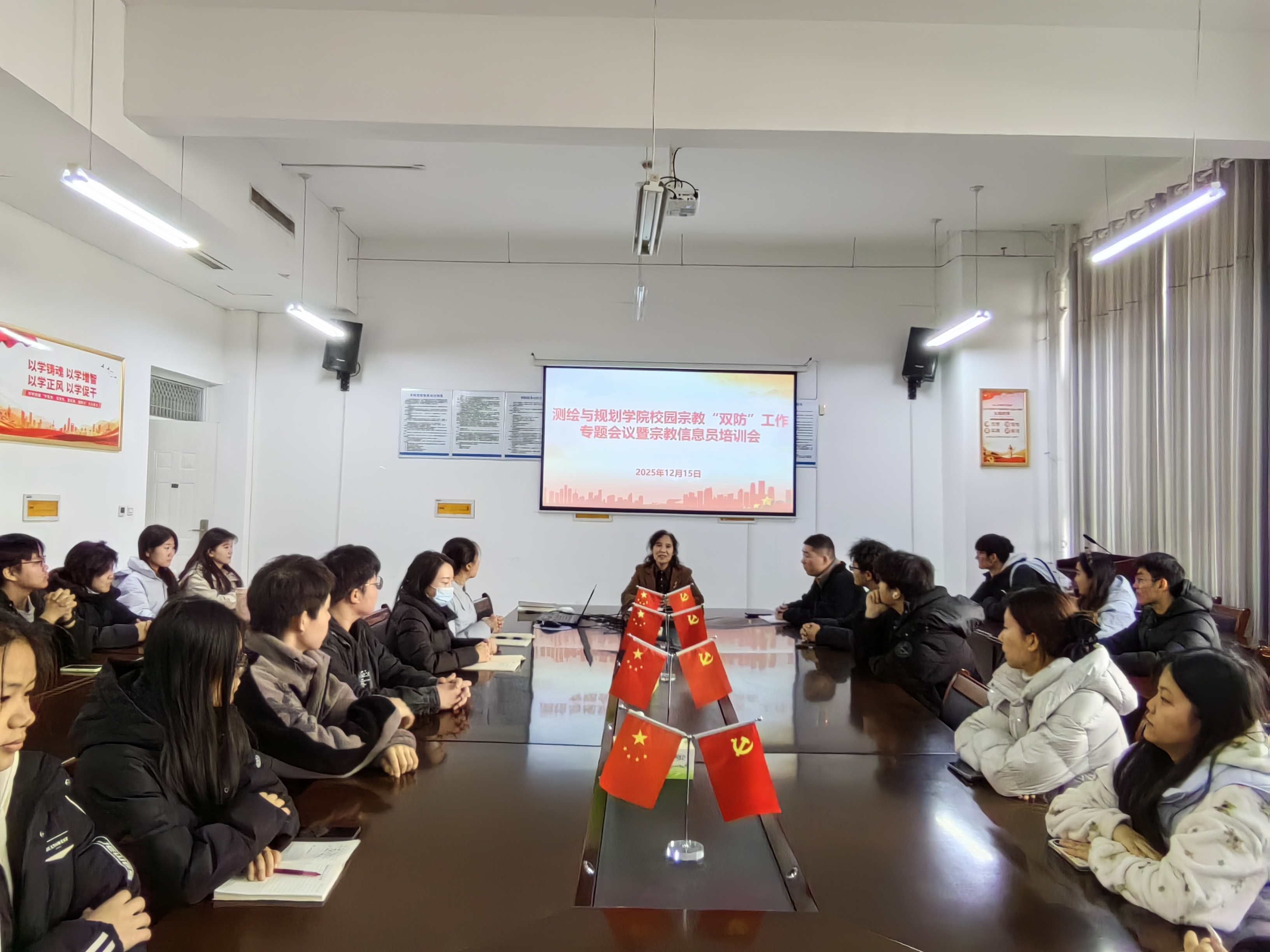2025年12月15日,beat365中文官方网站召开校园宗教“双防”工作专题会议暨宗教信息员培训会,学院全体班级宗教信息员、全体辅导员参加,会议由党委副书记王丽主持。