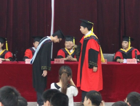 环境与规划学院全体领导班子分别为获得学士学位的毕业生拨流苏、正衣冠,颁发学士学位证,并与他们合影留念。