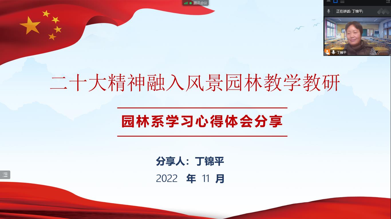 为深入学习贯彻党的二十大精神,将党的二十大精神融入教学和实践,园林系全体教师在2022年11月18日开展了学习党的二十大报告心得体会分享活动。