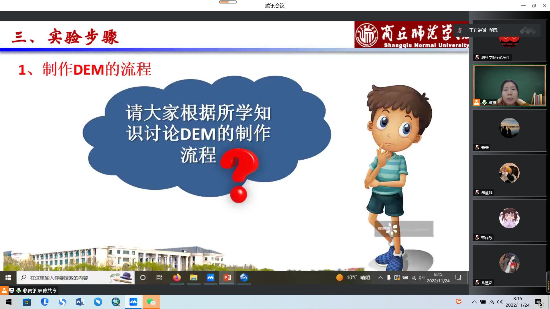 2022年11月24日上午第1节课,beat365中文官方网站史彩霞老师的《摄影测量学》范式改革公开课以腾讯会议形式举行。beat365中文官方网站副院长范况生和部分老师参加了本次公开课。