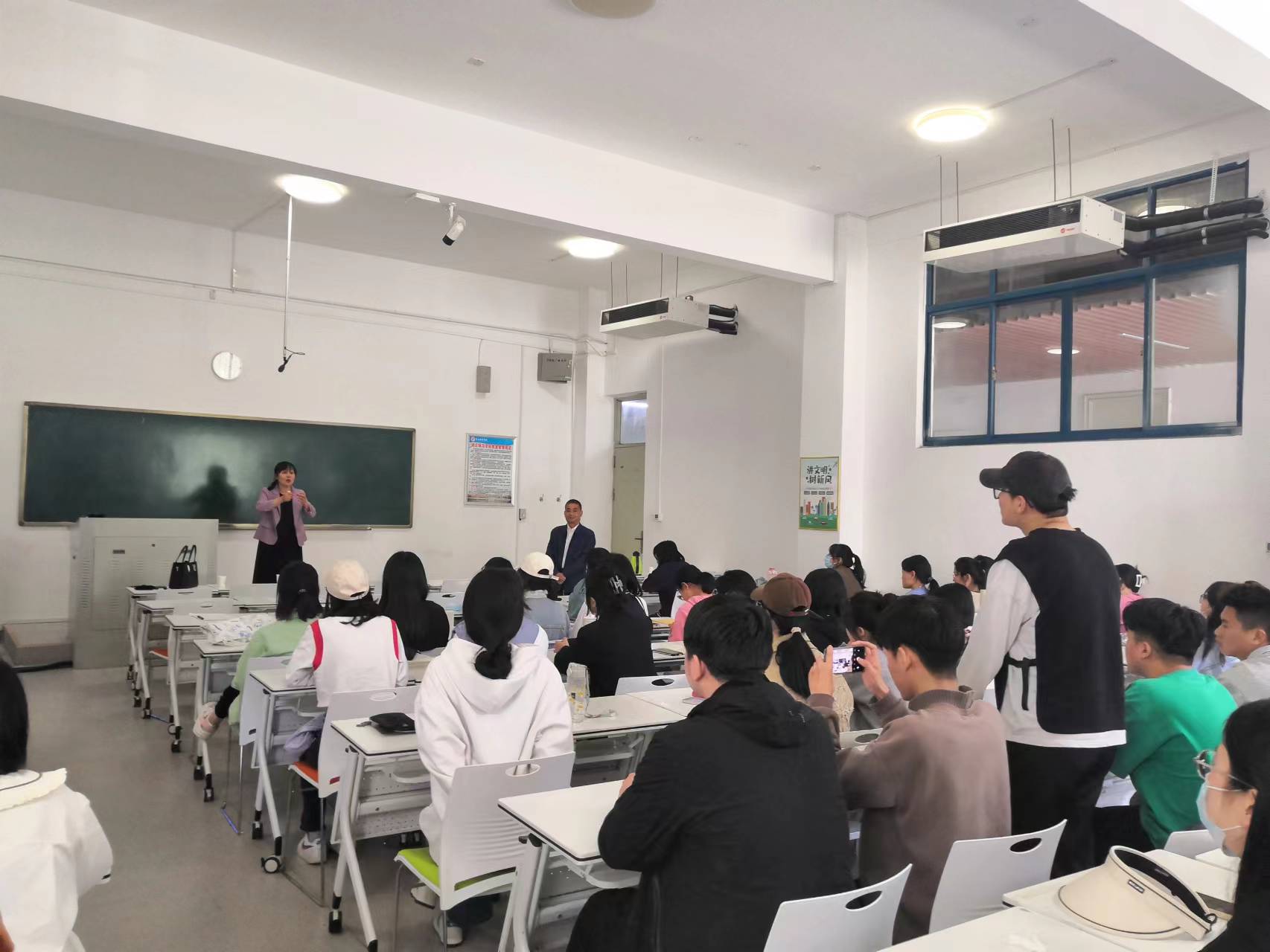 讲座结束后,杨笑䶮与程黎老师就如何练好三板技能与同学们进行交流和探讨。程黎老师现场快速地在黑板上给大家演绎绘制了中国轮廓图,她高超的板图技能博得了同学们的一片掌声。杨老师和程老师都强调“三板技能”提升没有什么金钥匙,必须多看多练,是一个逐步提高的过程。