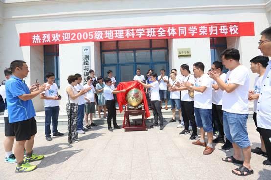 会后,所有与会人员在三商楼前合影留念,并举行纪念品捐赠仪式。校友精心挑选了专业特色纪念品——地球仪赠送学院,贺振、邝平共同为纪念品揭幕。随后,在老师带领下,校友们参观了学院地质地貌实验室、自然地理综合实验室等,重温了在校时的美好回忆。