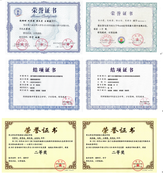 通过结合第一课堂和第二课堂、竞赛与专业知识、科研与竞赛项目等“四结合”策略,构建了“双创竞赛+专业实践+专业社团”的三位一体创新创业实践训练平台。这种综合模式旨在通过科研促进双创活动,以双创活动反哺教学,实现教学、科研和创新创业的有机融合,有效提升学生的创新创业实践能力。近年来,我们指导国家级创新创业训练计划项目3项,省级创新创业训练计划项目3项,荣获全国大学生GIS应用技能大赛二等奖5项,易智瑞杯中国大学生GIS软件开发竞赛二等奖6项、三等奖30余项。