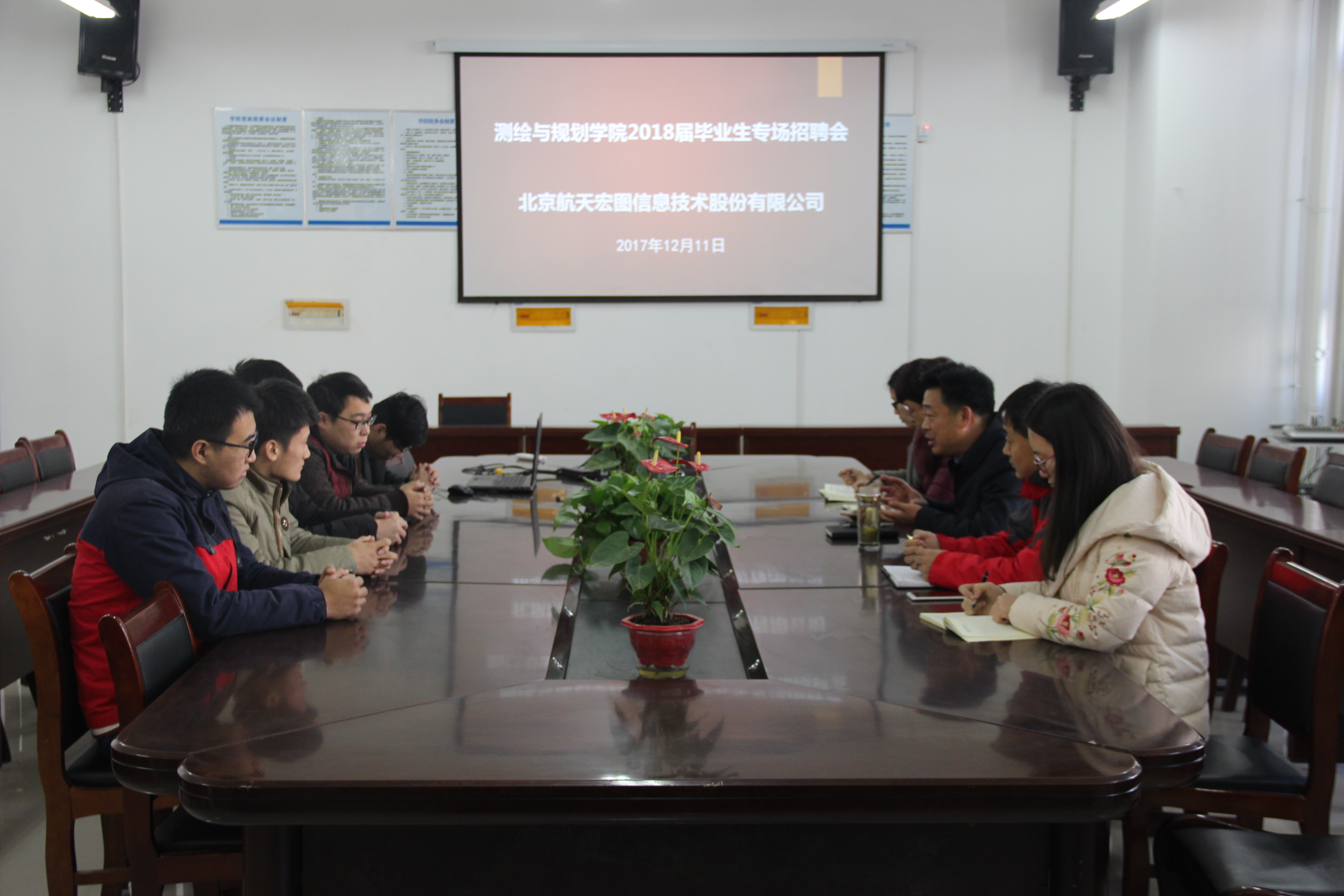 12月11日上午,北京航天宏图信息技术股份有限公司郝经理一行到beat365中文官方网站举行专场招聘会。beat365中文官方网站党总支书记王东平、副书记李琳、团总支书记路璐、就业专员魏理、毕业生辅导员寇亚莉出席本次招聘会。会议由王东平书记主持。